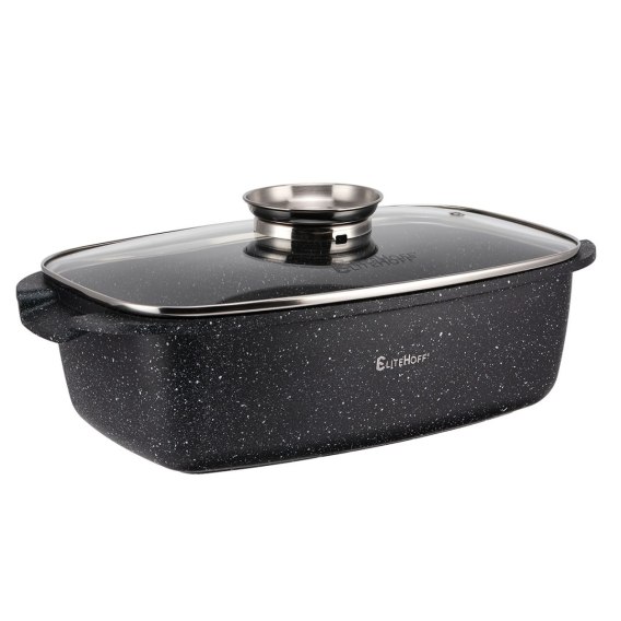 Brytfanna wykonana z odlewu aluminium. Nowej generacji powłoka marmurowa to wybór dla wszystkich, którzy chcą w prosty sposób przygotowywać zdrowe i smaczne posiłki, zapomnieć o przywieraniu jedzenia do dna garnka czy brytfanny i serwować potrawy o naturalnym smaku i w pełni soczyste. Można stosować zarówno do gotowania na kuchence jak i w piekarniku.