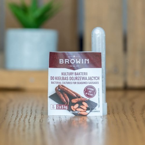 Idealnie dobrane kultury bakterii, dzięki którym bezpiecznie i szybko stworzymy dojrzewające domowe kiełbasy takie jak chorizo lub salami. Kultury bakterii zabezpieczają również przygotowywane wyroby przed rozwojem szkodliwych bakterii i nadają im charakterystycznego smaku oraz aromatu dojrzewających kiełbas. Fiolka wystarcza na 10 kg mięsa. Dlaczego warto używać kultur bakterii?? dojrzewające wyroby będziesz miał na wyciągnięcie ręki. kiełbasa dojrzewająca gotowa już w 10-14dni zapewnią bezpieczeństwo - dzięki nim będziesz mieć pewność że Twoje wyroby są chronione i bezpieczne przed rozwojem szkodliwych bakterii Charakterystyczny smak i aromat — produkt nie tylko przyśpiesza dojrzewanie mięs, ale nadaje im również szczególny i niepowtarzalny zapach oraz walory smakowe, które zachwycą wszystkich Twoich bliskich. Na 10 kg mięsa — fiolka kultur bakterii do kiełbas dojrzewających pozwoli Ci na przygotowanie, ok 7 kg ulubionych gotowych wyrobów dojrzewających! Przepis na 5 kg kiełbasy typu chorizo. Składniki:2 kg łopatki, 2 kg szynki, 0,5 kg wołowiny, 0,5 kg tłustego boczku, 200 ml zimnej wody, 75 g soli niejodowanej (3,5 łyżki), 15 g mielonej papryki ostrej (5 łyżeczek), 10 g mielonego pieprzu czarnego (3,5 łyżeczki), 7,5 g mielonej papryki czerwonej (2,5 łyżeczki), 7,5 g papryki czerwonej słodkiej wędzonej (2,5 łyżeczki), 6 g cukru (1 kopiasta łyżeczka), 5 g mielonego pieprzu białego (1,5 łyżeczki), 5 g czosnku granulowanego (1,5 łyżeczki), 2 g oregano (2 łyżeczki), 200 ml wina czerwonego wytrawnego, jelita wieprzowe, 1 g kultur bakterii (0,5 fiolki). Przepis: Łopatkę i szynkę zmiel na dużych oczkach o rozmiarze 10-12 mm lub za pomocą szarpaka. Boczek zmiel na oczkach 2 mm. Wołowinę zmiel dwukrotnie na oczkach 2 mm i wyrób ją z 200 ml zimnej wody, aż do otrzymania białego kleiku. Wszystkie rodzaje mięsa wymieszaj, dodaj przyprawy i dobrze wyrób dodając 200 ml wina. Całość odstaw na 2 godziny do lodówki. Następnie połowę zawartości fiolki wsyp do 10 ml zimnej wody, dobrze wymieszaj, dodaj do mięsa i dobrze wyrób. Za pomocą maszynki do nadziewania napełnij dość ciasno jelita farszem. Kiełbasę pozostaw do obsuszenia przez ok. 2 dni w temperaturze do 22°C, najlepiej w pozycji wiszącej, np. na stojaku wędliniarskim. Pozwoli to na aktywację dodanych bakterii. Po obsuszeniu przełóż kiełbasę do wędzarni i wędź ją w temperaturze 30-35°C przez 3 godziny. Do wędzenia użyj owocowych zrębków (czereśni lub śliwy). Następnie kiełbasę pozostaw na wieszaku w temperaturze do 22 °C przez kolejne 2 dni. Po tym czasie dla uzyskania najlepszego efektu zapakuj kiełbasę próżniowo i pozostaw w lodówce (+7°C) przez min. 6 dni. Zamiast pakowania próżniowego, kiełbasę można przechowywać w temp. +7'C i wilgotności ok. 85% w naczyniu z ociekaczem oraz z dostępem powietrza. Cały proces przygotowania kiełbasy zajmie Ci 10 dni. Dla uzyskania jeszcze bardziej wyrazistego smaku możesz wydłużyć okres dojrzewania.