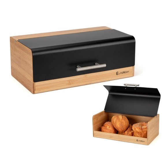 Nowoczesna forma chlebaka, jego efektowny kształt oraz połączenie metalu w czarnym kolorze z bambusem świetnie prezentują się na blacie.
