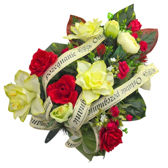 Wiązankę cechuje gęsty splot sztucznych gałązek iglastych, które tworzą estetycznie wyglądające tło dla unikalnej kompozycji sztucznych kwiatów. Starannie dobrane kwiaty są niezwykle realistyczne i naturalne, dodając wiązance autentyczności i podkreślając jej uroczysty charakter.