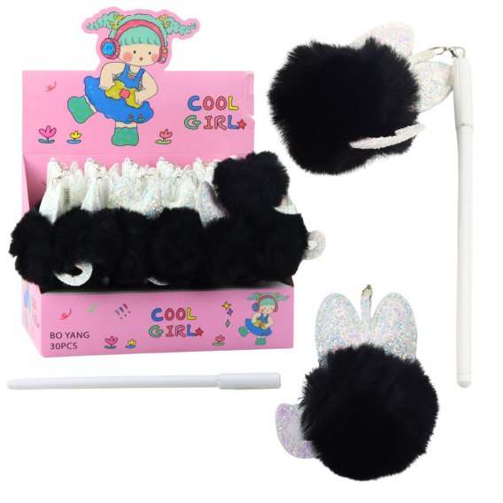 - Długopis żelowy z pomponem - czarny z uszkami