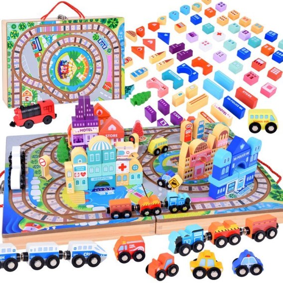 Odkryj fascynujący świat kolejowych podróży z zestawem drewnianych klocków, który przeniesie Twoje dziecko w magiczny świat miasta pełnego przygód!