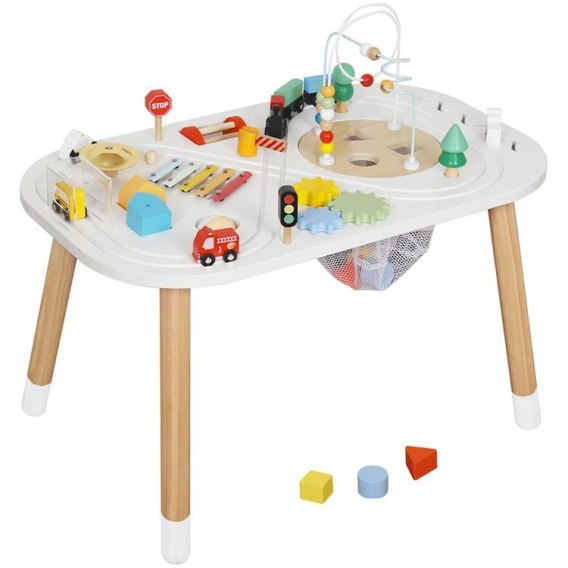 - Multifunkcyjność: Stolik zawiera cymbałki, tor samochodowy, ruchome elementy, znaki drogowe i wiele innych edukacyjnych zabawek.