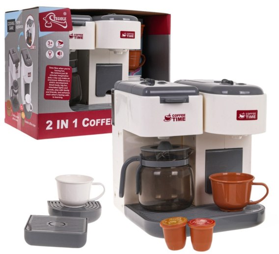 Interaktywny zestaw 2 w 1, zaparzacz do kawy z ekspresem na kapsułki i akcesoriami dla dzieci powyżej 3-go roku życia. Zabawka łączy w sobie dwa urządzenia, które możemy używać jednocześnie, lub odłączyć je od siebie i bawić się nimi osobno. Zaparzacz do kawy posiada otwieraną szufladkę na kawę, otwierany pojemnik na wodę oraz 3 przyciski: do zaparzenia małej kawy, dużej oraz przycisk do uruchomienia funkcji wody. Podczas zaparzania kawy słychać odgłosy oraz mruga czerwone światełko przy wylocie z wodą. Ekspres kapsułkowy posiada otwierany pojemniczek na kapsułki, pojemniczek na wodę oraz przyciski do zaparzania małej i dużej kawy. Podczas parzenia identycznie jak w zaparzaczu do kawy słychać odgłosy parzenia i mruga czerwone światełko przy wylocie z wodą. Zabawka zasilana jest bateriami typu 4 x AA 1,5 V (brak w zestawie).
