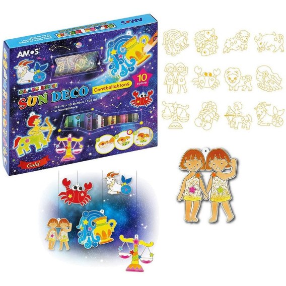 * w opakowaniu: 12 gotowych witraży &ndash breloków do pomalowania, 10 pojemników 10,5 ml z farbą