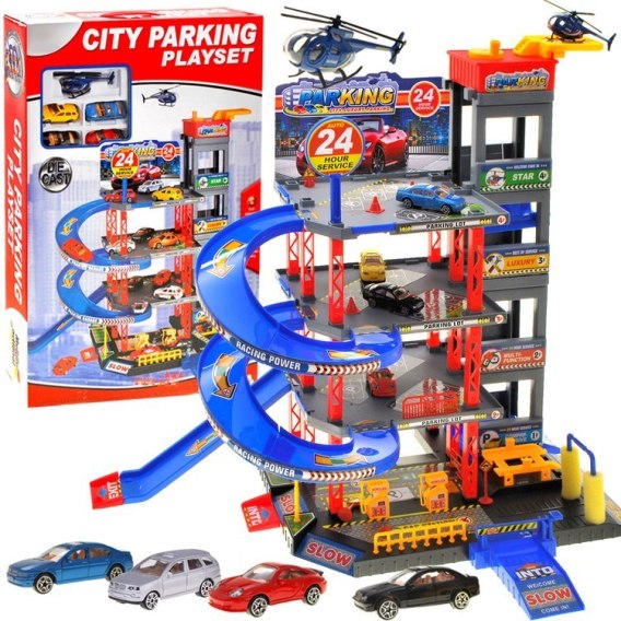 Zabawka garaż, piętrowy parking z windą. Autko metalowe.