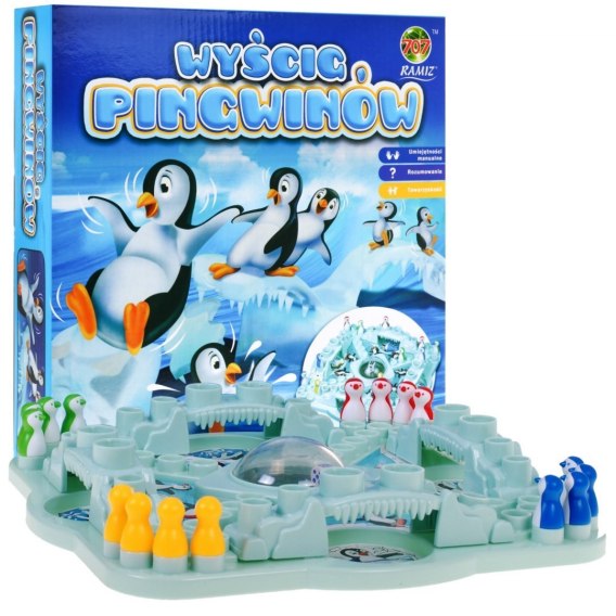Pingwiny poruszają się po specjalnie zaprojektowanej planszy z „lodowymi mostami" zgodnie z ruchem wskazówek zegara.
