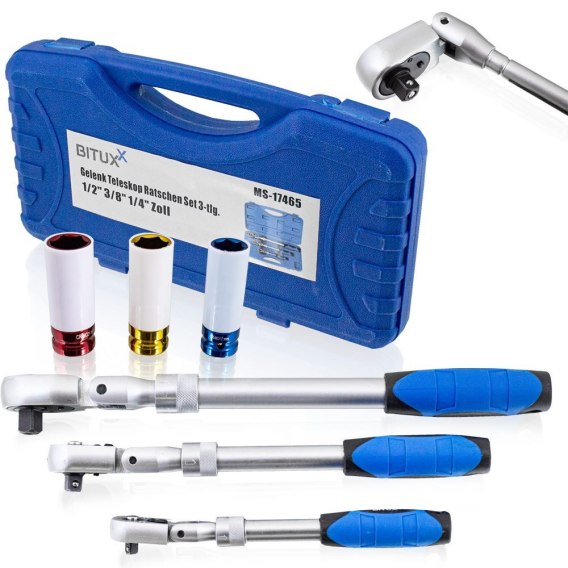 🔧 Zestaw 3 Teleskopowych Grzechotek z Nakrętkami Ochronnymi - Stal CrV Profesjonalny zestaw 3 teleskopowych, łamanych grzechotek z dodatkowymi nakrętkami ochronnymi. Regulowane w 10 pozycjach, wyposażone w ergonomiczne uchwyty i funkcję przedłużania. W zestawie poręczne etui.