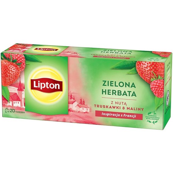 - nuta truskawek i malin (zielona herbata z nutą truskawek i malin, inspiracja z Francji, torebki pochodzenia roślinnego, składniki: herbata zielona, maltodekstryna, aromat, maliny (1 %), truskawki (1 %), waga opakowania: 28 g)