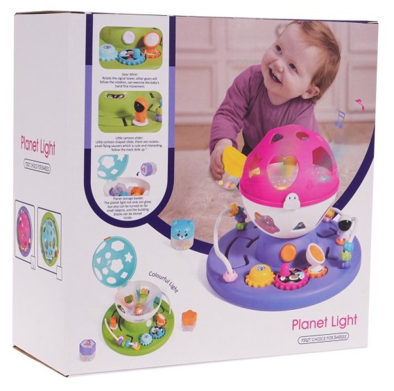 Interaktywny, edukacyjny, sorter o tematyce kosmosu dla maluszków od 18-go miesiąca życia. Sorter wykonany został z najlepszej jakości plastiku w żywych kolorach, przyciągających wzrok maluszka. Zabawka składa się z podstawki, na której  znajdują się kółeczka zębate do kręcenia, labirynty do pokonania i przekładanki. Na podstawce jest również okrągły sorter  z otworami w kształcie figur geometrycznych. Maluszek musi przypasować klocuszki znajdujące się w zestawie do odpowiednich kształtów na sorterze. Po dopasowaniu wszystkich klocków sorter można otworzyć i zabawę rozpocząć na nowo. W zestawie znajdują się 4 klocuszki. Dodatkowo każdy z nich w środku posiada małe kuleczki, które sprawiają, że klocuszek grzechocze. Sorter posiada również funkcję światła i dźwięku, z wnętrza kuli wydobywa się gwiezdny blask i słychać melodie. Zabawa tym sorterem uczy maluszka dopasowywać i kategoryzować według kształtu i koloru. Poprawia zdolności poznawcze i motoryczne. Dziecko poznaje przyczynę i skutek oraz doskonali umiejętności rozwiązywania problemu. Zabawka zasilana jest bateriami typu 3 x AA 1,5 V (brak w zestawie).