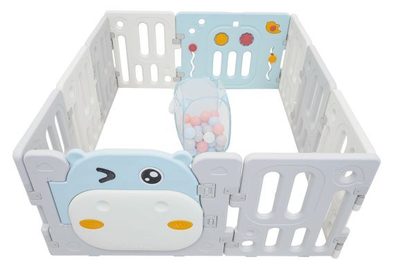 Duży, praktyczny, składany kojec modułowy dla dziecka od-6 go miesiąca życia. Z kojca możemy ułożyć dowolną konstrukcję, według własnych upodobań, bardzo łatwo się składa i rozkłada, jest stabilny  i posiada gładkie krawędzie. Wnętrze kojca wyposażono w manipulacyjne elementy takie jak przesuwane kółeczko, zębatki, piszczałkę czy kierownicę. Zestaw wykonano z trwałych i nietoksycznych materiałów, składa się z 10 paneli. Panel drzwi blokuje się, na zewnątrz uniemożliwiając otwarcie drzwi przez dziecko. Antypoślizgowe nóżki zapobiegają przesuwaniu się kojca. W kojcu twój maluszek będzie mieć wystarczającą ilość miejsca do swobodnego przemieszczania się, a jednocześnie będzie bezpieczny. W zestawie znajduje się również kosz na piłeczki i 40 piłeczek.