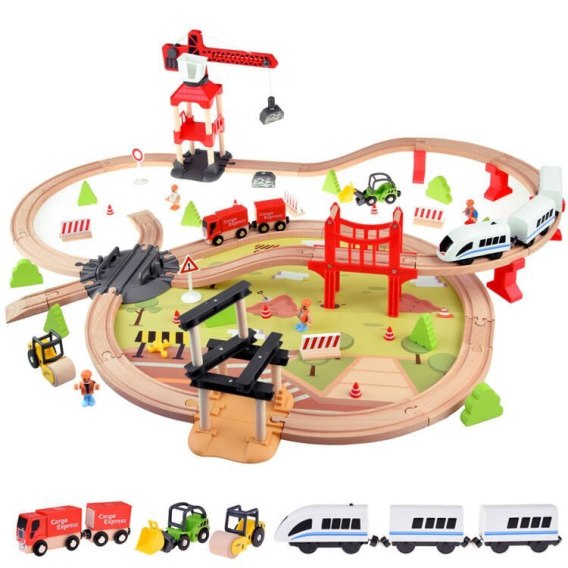 Drewniany zestaw z kolejką to ponadczasowa wspaniała zabawka, która z pewnością ucieszy każde dziecko. Ten wieloelementowy zestaw składa się z około 100 różnych drewnianych oraz plastikowych części i akcesoriów, które posłużą do zbudowania świetnej bazy transportowej z torami i miejscem do przeładunku towarów. W zestawie znajdują się pojazdy: koparka, walec, ciężarówka z naczepą oraz możliwością dokładania załadunku w kontenerach oraz plastikowa kolejka z dwoma wagonami, które są łączone za pomocą magnesów. Atrakcją zestawu jest to, że po zamontowaniu baterii pociąg jeździ po torach i ma możliwość jazdy w przód lub w tył. Znajdziemy tutaj też: figurki ludzi, znaki drogowe, krzewy, plastikowe elementy do budowy wiaduktu oraz elementy do zbudowania dźwigu.