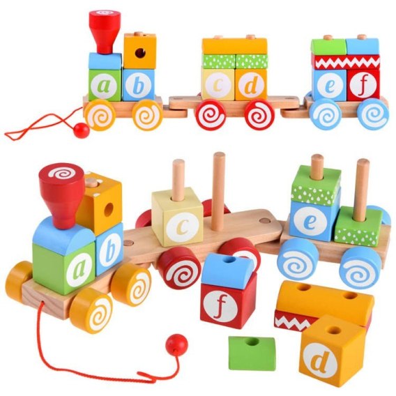 Pociąg jest wykonany z drewna. Składa się z kilkunastu elementów m.in lokomotywy oraz dwóch wagoników. Na drewniane bolce można nałożyć klocki w kształcie figur geometrycznych. Na kwadracikach widnieją literki oraz prostokąty z wzorami. Zabawa poprzez naukę daje najlepsze efekty. Klocki pomagają rozwijać koordynacje ruchową, wspiera rozwój wyobraźni i myślenia przestrzennego, rozwija logikę oraz planowanie. W sklepie Jokomisiada znajdziecie Państwo szereg edukacyjnych zabawek dla najmłodszych pociech. Zestaw zapakowany w efektowne opakowanie.
