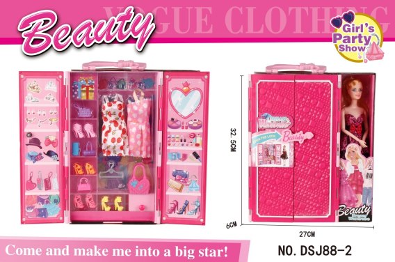 Lalka z Garderobą dla dzieci 3+ Ruchome elementy + 2 Sukienki + 5 Torebek + 4 pary Butów + 3 Wieszaki