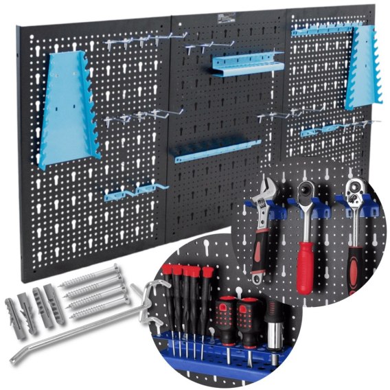 Trójczęściowa ścianka narzędziowa z 25 uchwytami i solidną stalową konstrukcją. Modułowe panele, łatwy montaż i estetyczny wygląd zapewniają porządek oraz profesjonalizm w każdym warsztacie.