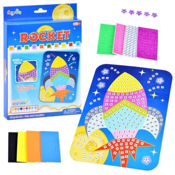 Mozaika Rakieta to kreatywny zestaw dla dzieci lubiących prace plastyczne. Zestaw składający się kolorowego obrazka, na który należy wykleić piankowymi kwadracikami, oczywiście dostosowując kolory i kształty.