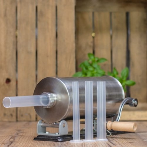 Nadziewarka ręczna doskonale sprawdzi się w wyrobie domowych wędlin. Doskonała do napełnienia farszem osłonek wędliniarskich takich jak jelita. W efekcie końcowym otrzymamy kiełbasy, parówki, kabanosy, salami itp. Nadziewarka jest niezwykle prosta w obsłudze, dzięki czemu świetnie sprawdzi się w praktyce dla domowego masarza, jak i w małych masarniach. Wykonana została ze stali nierdzewnej. Układ napełniania pozwala na szybką oraz łatwą obsługę. W zestawie wraz z nadziewarką są 4 plastikowe lejki w różnych rozmiarach. Średnice lejków: 15mm 19mm 22mm 25mm Jak używać nadziewarki? Na okrągłej nakładce zamontuj lejek Nakładkę z lejkiem dokręć do aluminiowego cylindra. Umocnij korbę na spiralnym tłoku za pomocą śrubki znajdującą się w zestawie, a następnie osłonę pierścieniową tylną przekręć do końca tłoka zakończonego dyskiem. Napełnij farszem cylinder. Urządzenie ustaw na płaskim, stabilnym podłożu np. blacie kuchennym bądź stole i przy pomocy zacisków przymocuj nadziewarkę do blatu kuchennego czy stołu. Spiralny tłok z osłoną pierścieniową tylną i z zamontowaną korbką wsuń do aluminiowego pojemnika z farszem i dobrze nakręć na pojemnik. Jeżeli nadziewarka jest napełniona i dobrze zamocowana, możesz rozpocząć prac Jak dbać o nadziewarkę? przed pierwszym użyciem umyj nadziewarkę ciepłą wodą przed użyciem rozprowadź łyżeczkę dowolnego oleju jadalnego na jej powierzchni