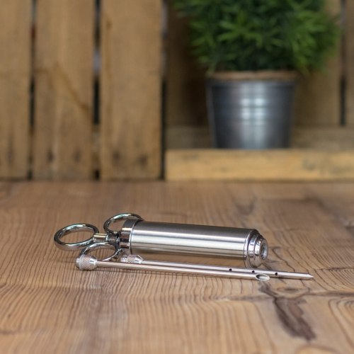 Nastrzykiwarka do mięsa przyda się w przygotowaniach domowych wyrobów. To właśnie dzięki nastrzykiwarce będziesz w stanie równomiernie rozprowadzić solankę wewnątrz mięsa, które będziesz wędzić. Dlaczego warto nastrzykiwać mięso? Nastrzykiwanie jest formą zakonserwowania mięsa. Peklowanie mięsa nie jest możliwe bez odpowiedniego wprowadzenia solanki wewnątrz mięsa. Nastrzykiwanie pomoże we właściwy sposób nawodnić solanką wybrany wyrób. Dzięki równomiernego rozprowadzeniu solanki Twójj wyrób będzie aromatyczny, a także będzie smakowicie wyglądał. Oczywiście możesz uwędzić bez nastrzykiwania, lecz większe kawałki mogą być nie dopeklowane. Wędliny, które są nastrzyknięte, w przekroju będą miały różową barwę. Możesz nastrzykiwać każdy rodzaj mięsa, drób, dziczyznę, wołowinę lub wieprzowinę. Jak nastrzykiwać mięso? 1. Przygotuj solankę do nastrzykiwania. 2. Napełnij strzykawkę roztworem. 3. Mięso umieść w dużym naczyniu, tak aby nadmiar roztworu nie rozlał się. 4. Umieść igłę w mięsie na różnych głębokościach wykonując nastrzyk. 5. Czynność powtarzaj w ok. 5cm odstępach. Co wchodzi w skład nastrzykiwarki? strzykawka wielokrotnego użytku o pojemności 100ml z podziałką co 10ml 2 igły o długości ze stali nierdzewnej Jedna igła zakończona jest szerokim wylotem i przeznaczona jest do aplikowania marynat z dużymi kawałkami przypraw. Druga igła posiada wiele otworów na różnych wysokościach, co ułatwia równomierne nastrzykiwanie mięsa. Wskazówka: Szynkę nastrzykuj w poprzek włókien