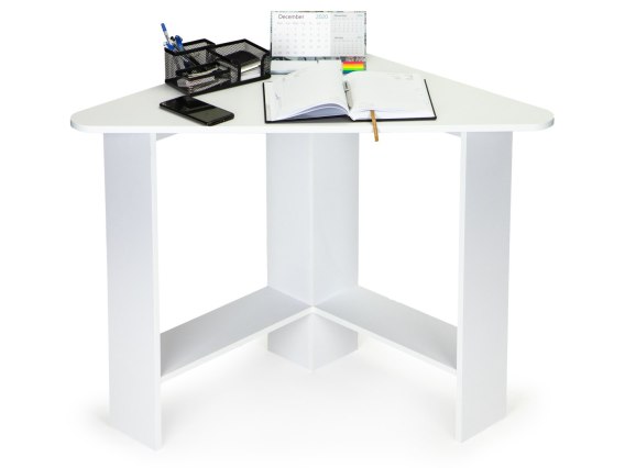 Biurko narożne to idealne rozwiązanie w sytuacji, kiedy chcemy umeblować małe pomieszczenie. Dzięki temu, że blat i konstrukcja biurka mają kształt trójkąta, mebel idealnie wpasuje się w narożnik pokoju, biura, czy recepcji. W jego dolnej części znajdują się dwie półki, odpowiednie do postawienia na nich komputera.