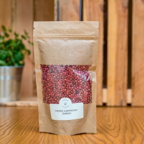 Pieprz czerwony znany jako pieprz peruwiański to roślina uprawiana w Ameryce Południowej. Ma ciekawy, nieco mocniejszy aromat niż jego popularny brat pieprz czarny. Jego smak jest wielowymiarowy, ziołowo-kwiatowy z cytrynowymi nutami. Najpierw delikatny lekko drapiący, by w końcu pokazać się w pełnej krasie i zaprezentować ostrość. Przez wiele stuleci, gdy pieprz czarny był przyprawą niezwykle drogą, prowokującą wojny na świecie, w strefie tropikalnej pieprz różowy był jego tanim i łatwo dostępnym zamiennikiem. Dodatkowo podobnie jak pieprz czarny, oprócz szerokiego zastosowania w kuchni ma on wiele właściwości prozdrowotnych. Właściwości pieprzu czerwonego: znacznie osłabia bakterie, ma w sobie duże ilości antyoksydantów, które pomagają usuwać wolne rodniki z organizmu, wzmacnia system odpornościowy, dodaje energii, działa uspokajająco na układ nerwowy. Możliwości zastosowania ziaren czerwonego pieprzu: jest doskonałym dodatkiem do delikatnych potraw, ciekawy dodatek do sosów, często stosowany jako składnik marynat bywa wykorzystywany do deserów, czasem stosowany do dekoracji dań. Ciekawostki: Należy przynajmniej początkowo uważać z pieprzem czerwonym, gdyż jak wskazują badania u niektórych osób może on wywoływać alergie.