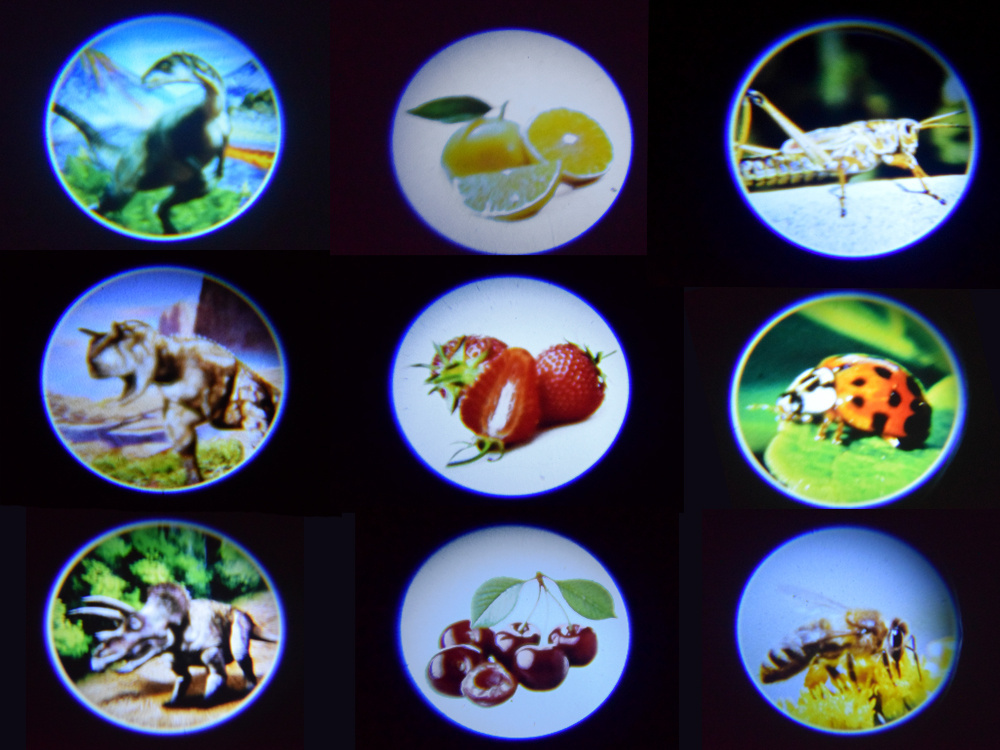 Projektor dla dzieci z kolorowymi obrazkami do wyświetlania w ciemności. Dzięki niewielkiemu rozmiarowi, jest on poręczny i zawsze można go zabrać ze sobą w każde miejsce. Zawsze można go mieć przy sobie np.: w pokoju podczas nocnego zasypiania, pod namiotem na wakacjach, u babci i dziadka podczas spędzania weekendu. Ręczny projektor znajdzie zastosowanie podczas wieczornych zabaw, opowiadań, tworzenia własnych historii. 3 tarcze ze slajdami sprawią, że gadżet szybko się nie znudzi. Każda tarcza zawiera 8 obrazków o innej tematyce. Na pierwszej znajdują się różne dinozaury, na drugiej owady, a na trzeciej owoce. Bez zakładania slajdów może posłużyć jako latarka by wieczorami oświetlać ciemne zakamarki pokoju.