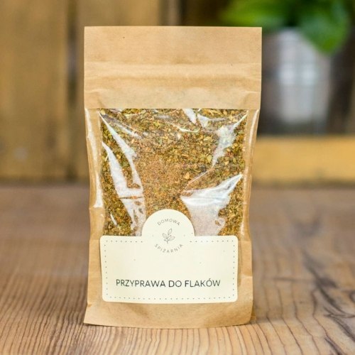 Przyprawa do flaków dzięki swej oryginalnej recepturze wzbogaca walory smakowe i zapachowe tej tradycyjnej, polskiej potrawy mięsnej w formie gęstej zupy, jaką są flaki. W Polsce flaki znane były już w XIV wieku i podobno stanowiły największy przysmak Władysława Jagiełły. Ich nazwa wywodzi się od jednego z głównych składników dania. Skład mieszanki do flaków to połączenie aromatycznych przypraw z przewagą pikantnych nut. Mieszanka do flaków: podkreśli i wzbogaci smak flaków, poprawia zapach i nadaje apetyczny kolor działa rozgrzewająco W skład przyprawy wchodzi: sól, oregano, cukier, papryka słodka, bazylia, tymianek, cząber, marchew, majeranek, cebula, chilli, pasternak i czosnek. Nasza mieszanka przyprawowa do flaków jest całkowicie naturalna, pozbawiona sztucznych aromatów i konserwantów. Nada ona flakom delikatnego rosołowego smaku, z wyraźną korzenną nutą. Flaki i przyprawy to najlepsze połączenie! Potrawa ta będzie mało apetyczna bez przypraw, ponieważ flaki same w sobie mają neutralny i łagodny smak, dlatego przyprawienie będzie niezbędne. Mdły smak flaków warto podkreślić pikantnymi przyprawami, ale także urozmaić go warzywami i innymi dodatkami. Ciekawostki: Aby uzyskać najlepszy elekt i wydobyć maksimum smaku i aromatu, przyprawę dodaj w połowie gotowania.