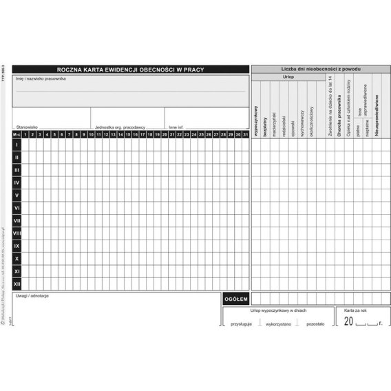ROCZNA KARTA EWIDENCJI OBECNOŚCI W PRACY A5