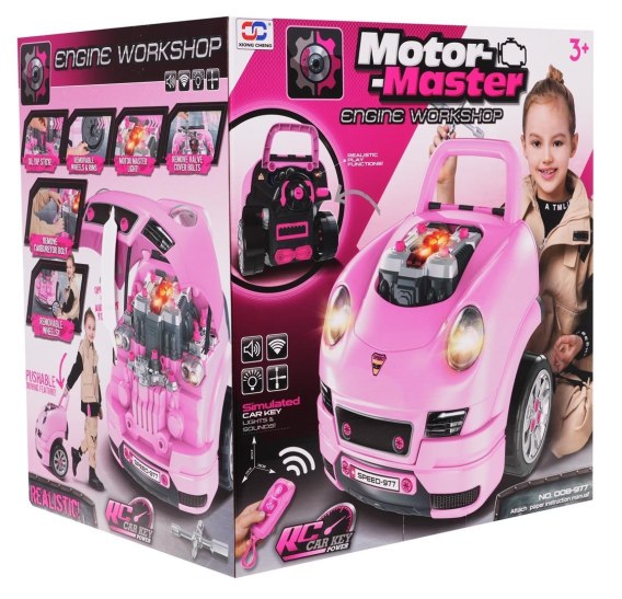 Interaktywna zabawka, przód pojazdu z podnoszoną maską oraz deską rozdzielczą przeznaczona dla dzieci od 3-go roku życia. Komplet zawiera elementy pojazdu oraz narzędzia potrzebne w montażu i demontażu części takie jak śrubokręt, czy klucze. Pod maską pojazdu znajduje się duży rozkręcany silnik, który dziecko może rozłożyć na czynniki pierwsze. Do wymiany nadają się także świece zapłonowe oraz koła. Na desce rozdzielczej znajduje się przycisk startu pojazdu z odgłosami zapalania silnika, ruchoma kierownica z klaksonem oraz sygnalizator awaryjny. Pod kierownicą umiejscowiony jest schowek, do którego można włożyć wszystkie niezbędne narzędzia, śruby, pokrętła. Samochód wyposażony jest w automatyczną skrzynię biegów-posiada drążek zmiany biegów jak w prawdziwym pojeździe. W zależności od zmiany drążku biegu na odpowiednie przełożenie usłyszymy odgłos na przykład odpalonego pojazdu, odgłos jazdy lub przy biegu wstecznym odgłos cofania. Zestaw zawiera pilota w kształcie kluczyków do samochodu, który umożliwia sterowanie modułami świetlnym (świecące reflektory i góra silnika) i dźwiękowymi (odgłos otwierania i zamykania samochodu, klakson). Zabawka posiada wygodną rączkę do przenoszenia. Zasilanie bateriami typu 3 x AA 1,5 V - auto (brak w zestawie), CR2025 3V- pilot (w zestawie). Zabawka dla małego mechanika rozwija umiejętności manualne, małą motorykę oraz koordynację oko-ręka.