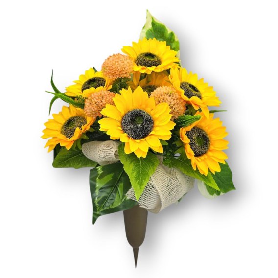 Estetyczny i trwały bukiet sztucznych kwiatów przeznaczony do wbijania w ziemię. Kompozycja oparta na wyrazistych, żółtych słonecznikach została wzbogacona pomarańczowymi kulistymi kwiatami oraz dekoracyjną zielenią. Całość umieszczona jest w wazonie na stabilnym plastikowym szpikulcu, co ułatwia umiejscowienie bukietu przy grobie, kapliczce lub krzyżu. Wazon jest obciążony betonem. Naturalny wygląd kwiatów oraz gustowny dodatek w postaci jutowej wstążki sprawiają, że dekoracja prezentuje się elegancko i schludnie przez długi czas - niezależnie od warunków atmosferycznych.