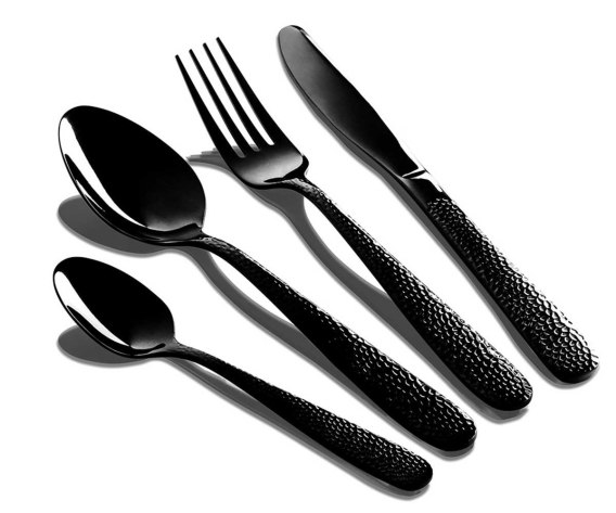 24 elementowy zestaw sztućców firmy BERLINGER HAUS wykonanych ze stali nierdzewnej w kolorze czarnym. Rękojeści z efektem "młotkowania"