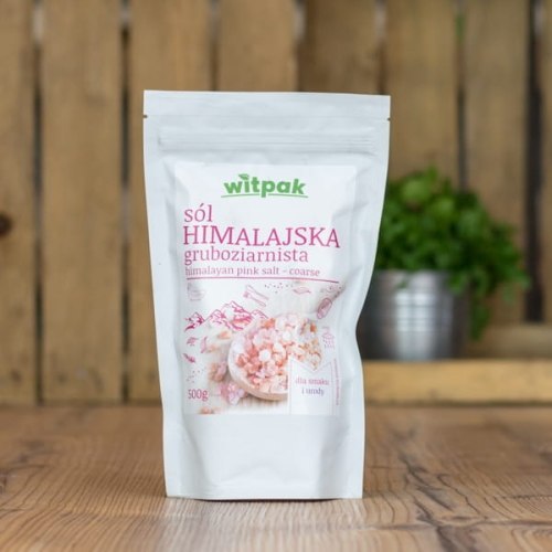 Sól himalajska różowa gruba jest sola kamienna pochodzącą z Pakistanu, gdzie znajduję się pod ziemią jej złoża, powstałe setki lat temu po osuszeniu oceanów. Swoją różową barwę zawdzięcza zawartości tlenku żelaza. Jest ona czystą solą, wydobywaną ręcznie metodą płukania i suszenia. To naturalny produkt nieprzetworzony przemysłowo. Właściwości soli himalajskiej: zawiera spore ilości potasu, wapnia i żelaza, usuwa toksyny z organizmu, łagodzi dolegliwości jelitowe, zwalcza infekcje jamy ustnej i gardła, reguluje gospodarkę wodną organizmu.   Możliwości zastosowania soli himalajskiej gruboziarnistej: w zastępstwie klasycznej soli kuchennej do każdej z potraw, w swojej gruboziarnistej formie idealnie sprawdza się do kuchennych młynków, gruboziarnista sól himalajska może być z powodzeniem wykorzystana jako peeling, roztworem wody z solą himalajską leczy się infekcje gardła i jamy ustnej, może być stosowana jako środek do inhalacji. Ciekawostki: Warto wspomnieć, że pomimo faktu że sól himalajska jest zdrowsza od soli kamiennej, nie należy zapominać, że każda sól spożywana w nadmiarze szkodzi naszym organizmom.