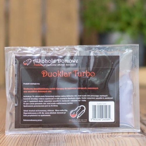 Klarowanie trunku powinno być naturalnym procesem, jednak w niektórych sytuacjach ten proces trzeba przyspieszyć. Martwe drożdże, substancje białkowe lub inne zmętnienia mogą negatywnie wpływać na smak i efekt finalny trunku. AD DUOKLAR TURBO jest dwuskładnikowym środkiem klarującym, którego działanie możesz zauważyć już po 24 godzinach. Kiedy stosować środka klarującego? do wina, które zbyt długo pozostaje mętnedo cukrówki przeznaczonej na destylat Jak używać środka klarującego ALKOHOLE - DOMOWE DUOKLAR TURBO? Po skończonej fermentacji nastaw lub wino zlej znad osadu, Dokładnie wymieszaj w celu usunięcia CO2, Dodaj zawartość saszetki A i zamieszaj, Po około 2-3 godzinach dodaj zawartość saszetki B, Zamieszaj i odstaw na dobę, Po 24h ponownie zlej znad osadu wyklarowany płyn. Po użyciu środka klarującego nastaw osiągnie doskonałą przejrzystość, a Ty możesz przystąpić do kolejnego etapu produkcji trunku.