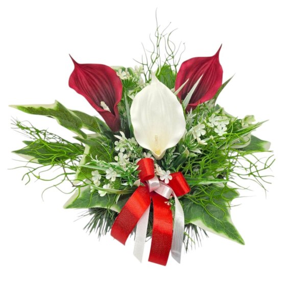 Stroik cechuje się unikalną kompozycją sztucznych kwiatów oraz innych dodatków. Starannie dobrane kwiaty są niezwykle realistyczne i naturalne, dodając wiązance autentyczności i podkreślając jej uroczysty charakter.