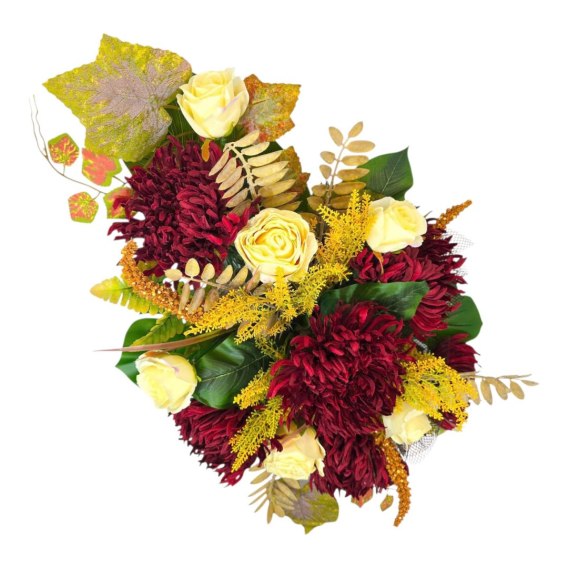 Stroik cechuje się unikalną kompozycją sztucznych kwiatów oraz innych dodatków. Starannie dobrane kwiaty są niezwykle realistyczne i naturalne, dodając wiązance autentyczności i podkreślając jej uroczysty charakter.