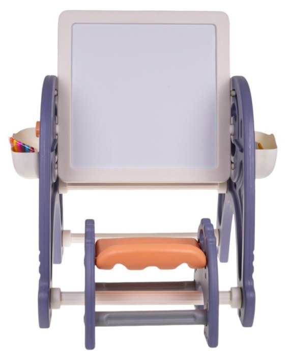 Zestaw 4 w 1, tablica, stolik, podkładka do układania klocków i krzesełko dla dzieci od 3-go roku życia. Zestaw wykonany został z najlepszej jakości plastiku, nie posiada ostrych krawędzi i jest stabilny. Na plastikowych nóżkach umieszczona jest tablica, którą można pochylać pod dowolnym kątem i obracać. Z jednej strony mamy tablicę do malowania a z drugiej podkładkę do układania klocków. Z tablicy i podkładki możemy korzystać w pozycji pionowej lub poziomej. W pozycji poziomej możemy korzystać z zestawu jak ze stolika do malowania, nauki czy jedzenia lub podstawki na klocki. Do zestawu dołączono gąbkę oraz 6 mazaków. Po bokach zestawu znajdują się również dwa kosze na przybory do malowania. Zestaw rozwija wyobraźnie i umiejętności poznawcze dzieci.
