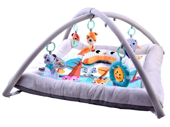 Urocza, miękka, elegancka mata edukacyjna dla najmłodszych dzieci przypadnie do gustu maluszkowi i rodzicom. Mata jest w jasno szarym kolorze z uroczą kontrastową grafiką. Materiał jest mięciutki i miły w dotyku. Boki maty są wypełnione miękkim wypełniaczem w celu ochrony maluszka podczas turlania się po macie. Mata edukacyjna została wyposażona w dopinane pałąki, na których można zawiesić zabawki. Zabawki zawiesza się na plastikowych kółeczkach.