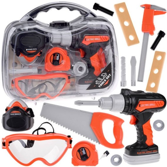 Walizka z niezbędnymi narzędziami to propozycja dla każdego małego pomocnika domowego. Zestaw narzędzi zawsze jest potrzebny, a to trzeba przykręcić śrubkę, przywiesić prosto obrazek, naprawić autko - zajęć zawsze jest mnóstwo. Dzięki temu zestawowi, wszystko będzie naprawione od ręki. Zestaw w całości wykonany jest z plastiku, w czarno szarej kolorystyce z pomarańczowymi wstawkami. Wkrętarka jest ruchoma, działa w obie strony, wystarczy założyć odpowiednią końcówkę, aby przykręcić lub odkręcić śrubkę. Suwmiarka, centymetr pozwolą odmierzyć odległość, średnicę, a gogle ochronne zabezpieczą oczy małego pomocnika. Cały zestaw bardzo atrakcyjnie wykonany, zapewne przypadnie do gustu każdemu małemu dziecku.
