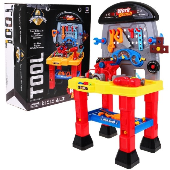 Prócz narzędzi w zestawie znajduje się również silnik zasilany na baterie wydający odgłosy i posiadający efekty świetlne oraz panel z atrapą mierników samochodowych.