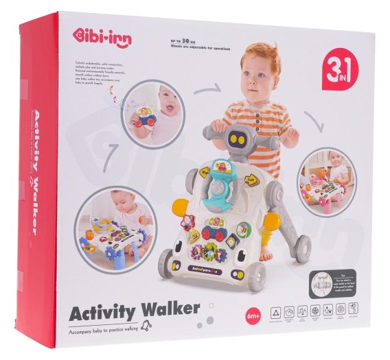 Chodzik edukacyjny, interaktywny stolik 2 w 1 dla dzieci od 12 miesięcy życia. Kolorowa, multifunkcyjna zabawka stymuluje rozwój dziecka na różnych płaszczyznach. Pchaczyk da się szybko przekształcić w stolik multifunkcyjny. Zdejmowany, kolorowy panel posiada dużo ruchomych elementów, które się da obracać, przesuwać, wciskać. Dodatkowo z panelu dziecko może również wyjąć mały interaktywny samochodzik i zabrać go wszędzie ze sobą. Samochodzik posiada efekty dźwiękowe i świetlne, a zasilany jest bateriami typu 2 x AAA 1,5 V (brak w zestawie).