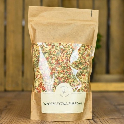 Włoszczyzna suszona: aromatyczny sekret domowych potraw Włoszczyzna suszona to połączenie tradycyjnych warzyw, które zostały delikatnie wysuszone, aby zachować ich naturalny smak i aromat. Mieszanka ta często składa się z marchwi, pietruszki (korzeń i natka), selera, pora oraz innych warzyw, które są podstawą wielu polskich i europejskich dań. Suszenie jest naturalną metodą konserwacji, dzięki której warzywa te można cieszyć się przez cały rok, niezależnie od sezonu. Zastosowanie włoszczyzny suszonej: W zupach i bulionach: Włoszczyzna suszona jest idealnym składnikiem domowych rosołów, bulionów czy krupników, dodając im głębi smaku i aromatu. Do potraw duszonych i gulaszów: Dodaj włoszczyznę do mięs i warzyw duszonych, aby wzbogacić smak potrawy. W sosach: Włoszczyzna suszona może być używana do aromatyzowania sosów do makaronów, mięs i ryb. Jako dodatek do kasz i ryżu: Urozmaić smak podstawowych składników posiłków, dodając do nich suszone warzywa podczas gotowania. W pieczeniach warzywnych i mięsnych: Posyp warzywa lub mięso włoszczyzną suszoną przed pieczeniem, aby nadać im wyjątkowego aromatu. Korzyści zdrowotne: Suszone warzywa zachowują większość wartości odżywczych świeżych produktów, w tym witaminy, minerały i błonnik. Regularne włączanie warzyw do diety wspiera zdrowie układu pokarmowego, sercowo-naczyniowego oraz przyczynia się do lepszego samopoczucia. Przechowywanie: Aby zachować świeżość i aromat włoszczyzny suszonej, przechowuj ją w szczelnym pojemniku, w suchym i chłodnym miejscu. Dzięki temu warzywa zachowają swoje właściwości smakowe i odżywcze na dłużej. Włoszczyzna suszona to prosty sposób, by dodać do codziennych posiłków bogactwo smaków i aromatów. Jej uniwersalność i łatwość użycia czynią ją niezastąpionym składnikiem w kuchni każdego miłośnika zdrowego i smacznego gotowania.
