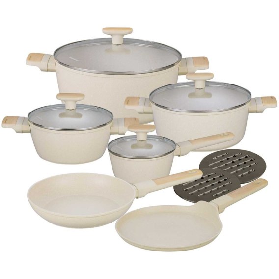 12-elementowy zestaw garnków marmurkowych w kolorze kremowym ze szklanymi pokrywami to kompletny i funkcjonalny zestaw kuchenny, idealny do przygotowywania różnorodnych dań. Dzięki eleganckiemu wyglądowi oraz solidnemu wykonaniu jest zarówno praktyczny, jak i stylowy. Poniżej szczegółowy opis elementów zestawu i ich właściwości.
