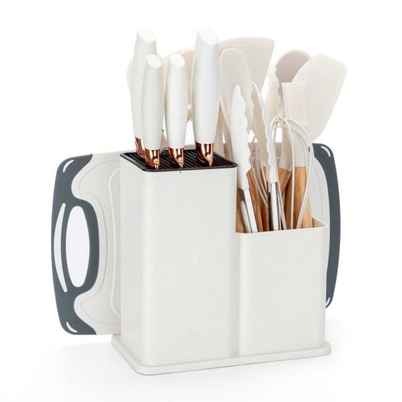 Zestaw 19-elementowy noży kuchennych oraz przyborów wraz z deską do krojenia w stojaku to kompletny i elegancki zestaw do każdej kuchni, który ułatwia codzienne przygotowywanie posiłków. Zestaw zawiera różnorodne noże do różnych zadań kuchennych - od krojenia chleba, przez porcjowanie mięsa, po siekanie warzyw, a także deskę do krojenia, zestaw łyżek i szpatuł, pędzelek silikonowy, ubijaczkę, szczypce, nożyce, które zwiększają jego funkcjonalność. Zestaw przyborów kuchennych wykonanych z drewna kauczukowego i nylonu termoplastycznego. Przybory dedykowane do naczyń z powłokami teflonowymi i ceramicznymi wrażliwymi na zarysowania. Część nylonowa odporna na temperaturę do 200°C