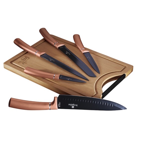 Zestaw 5 noży z bambusową deską do krojenia firmy BERLINGER HAUS z serii Rose Gold Collection.