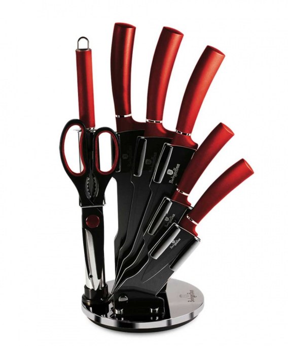 8 elementowy zestaw noży na stojaku firmy BERLINGER HAUS z serii Burgundy Metallic. Przeznaczone do porcjowania mięsa i ryb, krojenia pieczywa oraz obierania i siekania warzyw. Noże ze stali nierdzewnej dodatkowo pokryte powłoką nieprzywierającą non-stick. Wyposażone w uchwyty pokryte bardzo trwałą cienką warstwą antypoślizgową dla uzyskania pewnego trzymania w każdych warunkach.