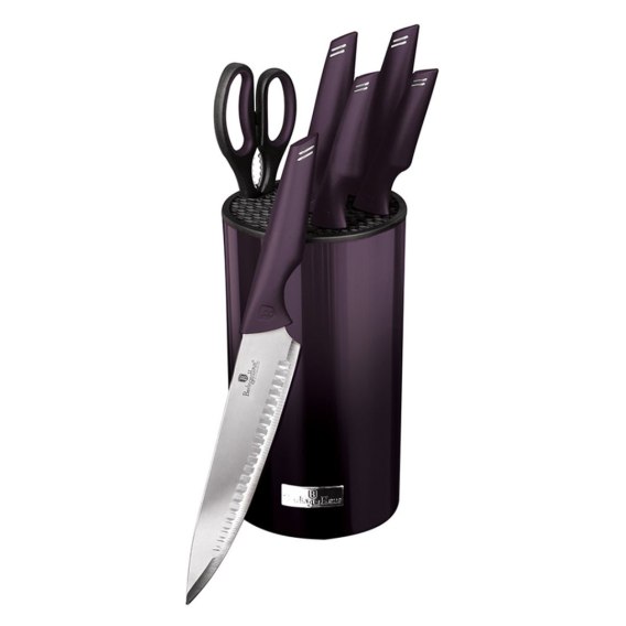 7 elementowy zestaw noży w bloku firmy BERLINGER HAUS z serii PURPLE ECLIPSE COLLECTION. Przeznaczone do porcjowania mięsa i ryb, krojenia pieczywa oraz obierania i siekania warzyw. Noże ze stali nierdzewnej. Wyposażone w uchwyty pokryte bardzo trwałą cienką warstwą silikonu dla uzyskania pewnego trzymania w każdych warunkach.
