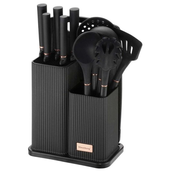 Zestaw 5 noży oraz 5 przyborów kuchennych z deską do krojenia w stojaku.
