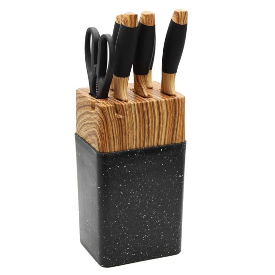 Zestaw 5 noży kuchennych w stojaku. W zestawie nożyce kuchenne. Stojak posiada wbudowaną ostrzałkę pozwalającą w razie potrzeby naostrzyć noże.
