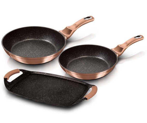 Zestaw 2 patelni + płyta grillowa BERLINGER HAUS z kolekcji ROSE GOLD. Patelnie: Ø22cm, Ø26cm,