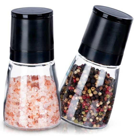 Zestaw dwóch ręcznych młynków do pieprzu i soli. Posiadają regulacje grubości mielenia za pomocą pokrętła. Wyposażone w pokrywkę oraz żarna ceramiczne.