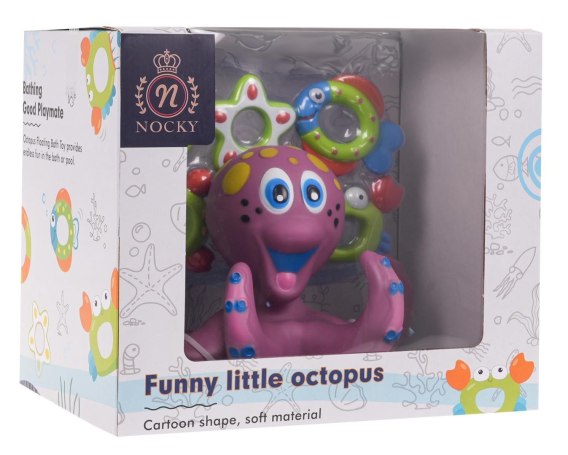 Zabawka do kąpieli, ośmiorniczka, dla dzieci od pierwszych dni życia. Zabawka składa się z dużej gumowej ośmiornicy i 5 krążków, które należy nakładać na macki ośmiornicy. Krążki przedstawiają zwierzątka morskie takie jak: krab, rybka, rak oraz gwiazdę i kółeczko. Zabawka wykonana została z najwyższej jakości materiałów, bezpiecznych dla dziecka. Umili czas kąpieli i rozwinie koordynację wzrokowo-ruchową.